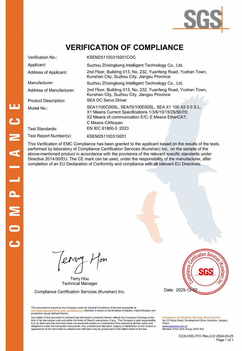 精越科技SEA高性能直流伺服驱动产品通过SGS的CE认证。SEA驱动器以较高的性能表现一次性通过SGS认证,这标志着SEA驱动器的性能得到了世界级实验室的权威认可。